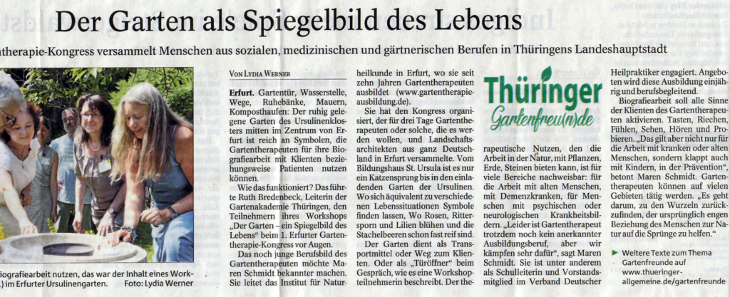 „Die gesundheitsfördernde und medizinische Wirkung bei der Beschäftigung im Garten findet in jüngster Zeit immer mehr Eingang in die therapeutischen Konzepte der verschiedensten medizinischen, geriatrischen, sozialen und therapeutischen Einrichtungen.“ (Zitat der Veranstalterin Maren Schmidt, Leiterin des Instituts für Naturheilkunde)